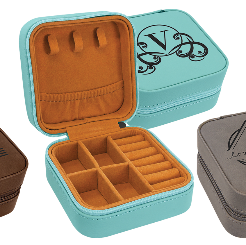 Laserable Leatherette travel jewelry boxes are compact for your suitcase or bag. Inside the black lined box are secured compartments for chains, rings, and earrings. Personalize the front, back, or both for a perfect custom gift-ideal for bridesmaid gifts! They are 4 inches x 4 inches x 2 inches in size.
