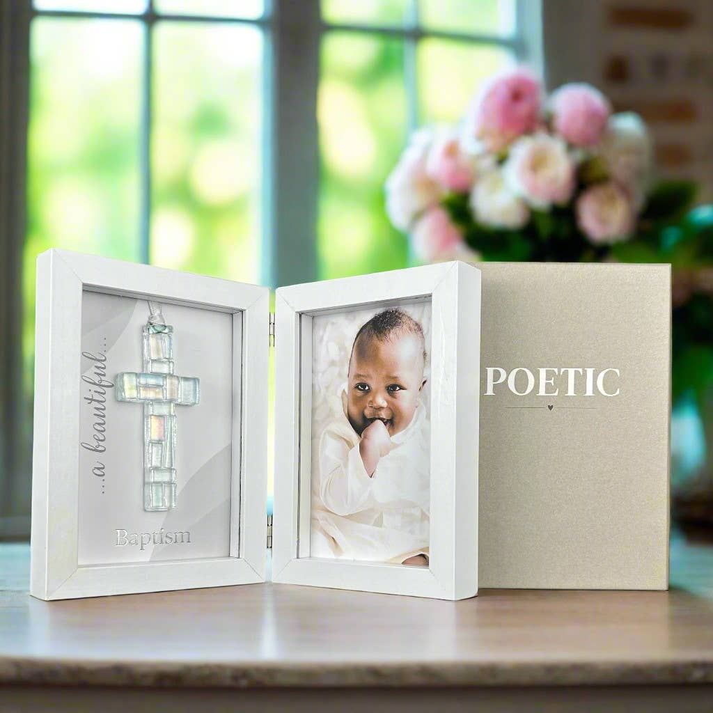 A unique gift for a baby's baptism, "A beautiful Baptism" artwork is framed with a 4" glass cross is handmade in the USA. Each baptism cross for baby will be a beautiful clear iridescent mosaic, uniquely handmade. Each cross has ripples and textures that are inherent in handmade glass adding beauty and character to each piece.