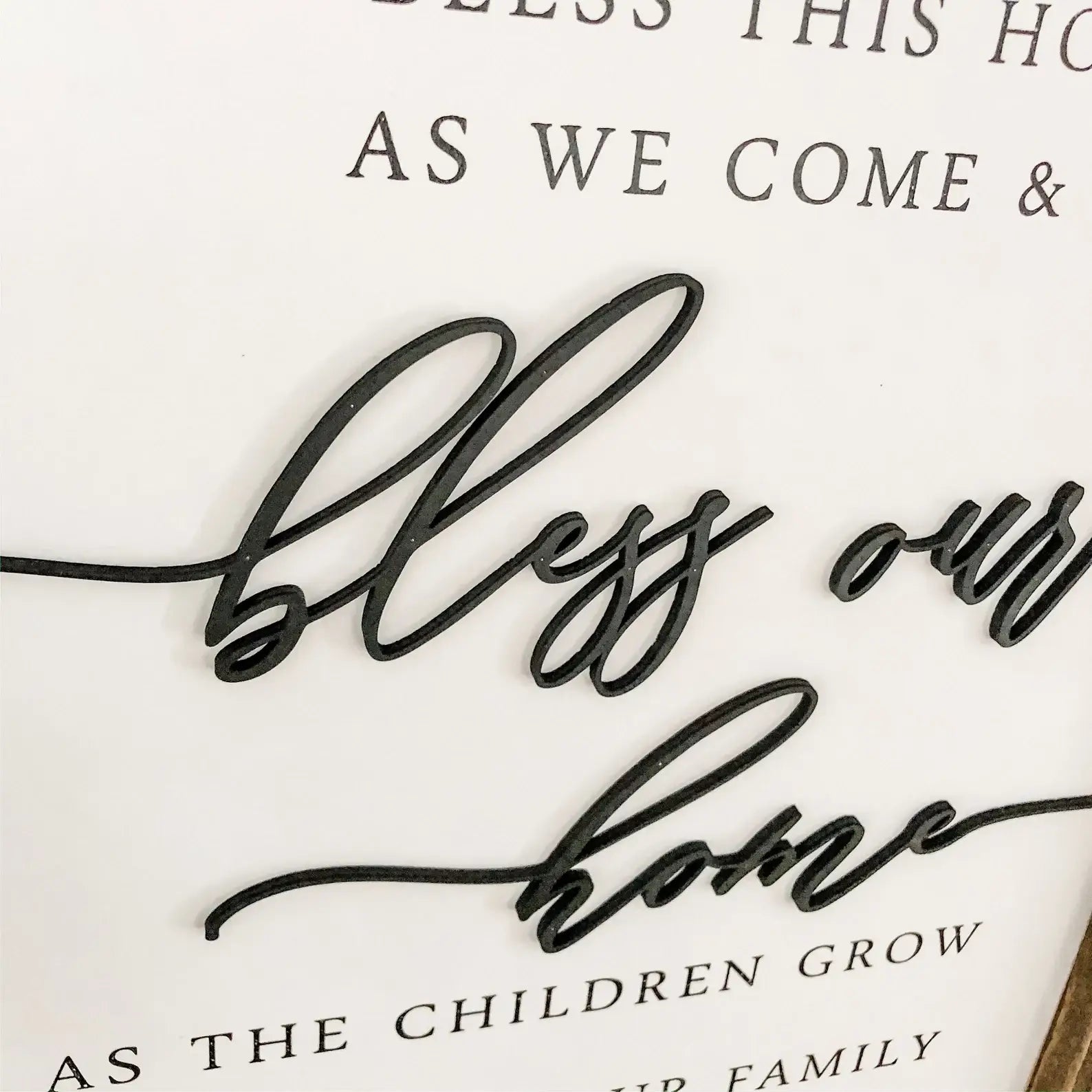 Handmade wooden signs using pine wood, with painted white background and darker stained frame. The "bless our home" wording is laser cut, giving each sign an added dimension.