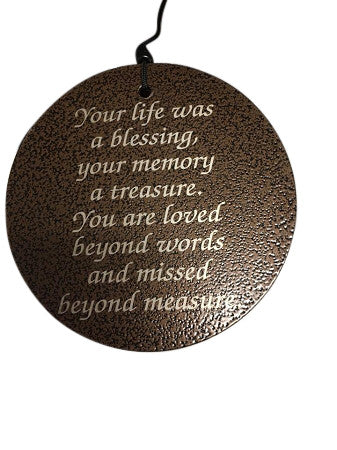 For Any Occasion, but our most sold chimes are for memorials. A memorial wind chime is a perfect way to keep your loved ones memory very much alive. These personalized, one of a kind items, are wonderful to look at and listen to. You will think of your loved one every time the wind blows.