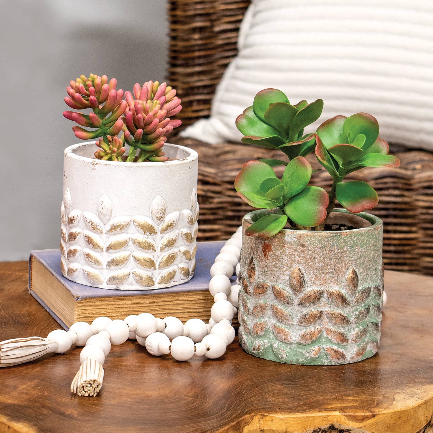 Don't stress about Springtime farmhouse displays! Add the Gold Distressed White Wheat Embossed Cement Planter for an easy and charming accent. This 4" tall by 4.5" diameter cement planter features a pressed wheat design. It has a distressed white finish with gold accents and will dress up a small potted plant or looks great with an artificial floral bush tucked inside.