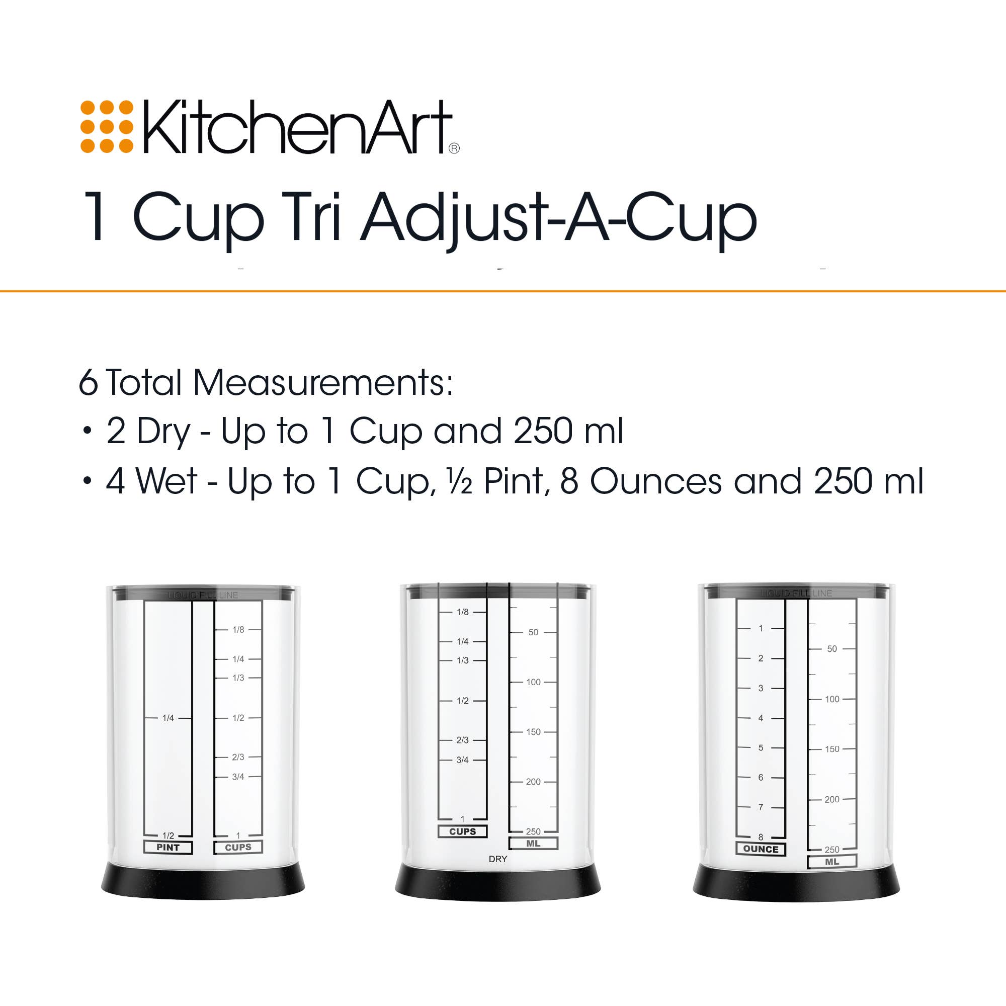 -MEASURE INGREDIENTS WITH EASE: Adjustable 1 cup measuring cup makes measuring liquids, dry, and semi-solid ingredients easy using only one convenient measuring tool. The pint, cup, ounce, and millimeter markings on the clear outer sheath make doubling and conversions a breeze; To use, simply pull the plunger down to the measurement indicated and add your ingredient