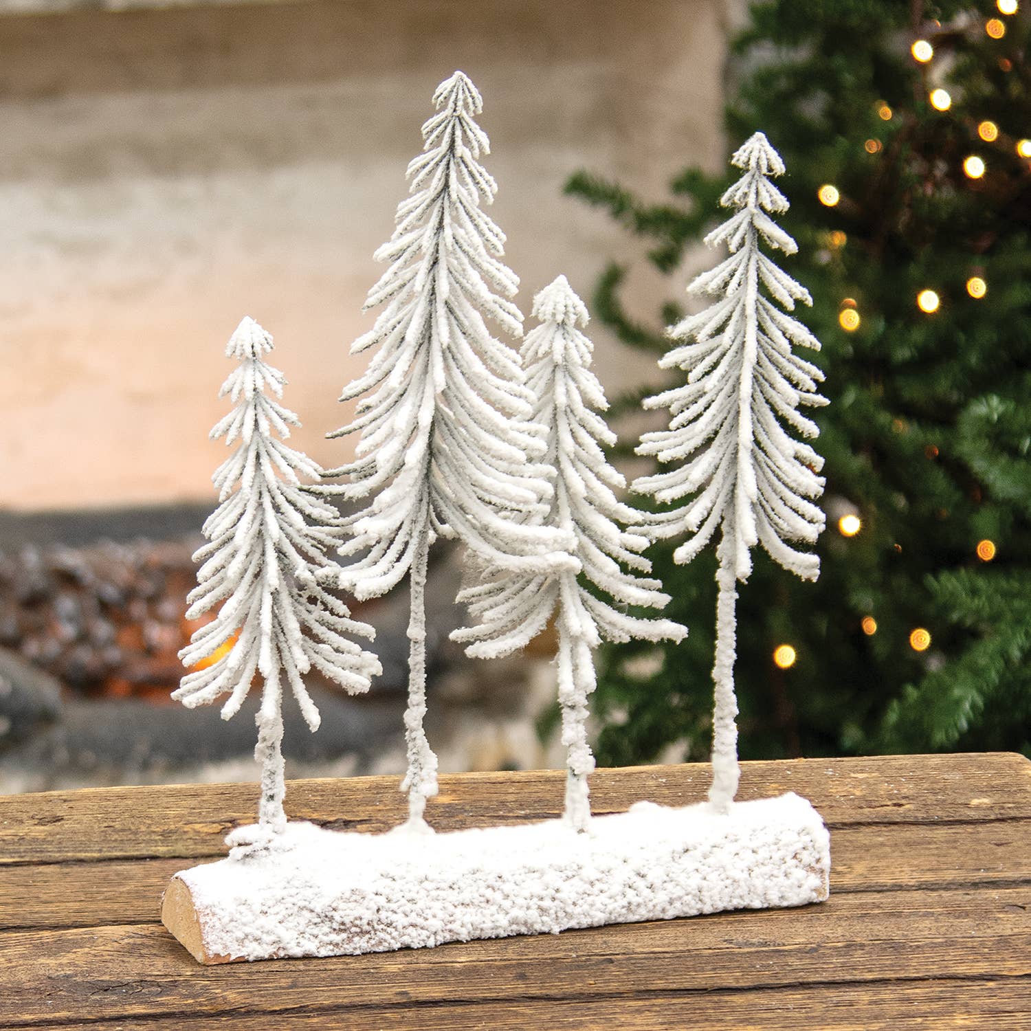 Add a touch of wintry wonder to displays this season with the Snowy Pine Forest on Log. Measuring 10" high by 8" wide with a 2" depth, this log features four trees with plastic green branches and topped with a dusting of flocked snow from branch to base. It has a sturdy, half-log base with a dark wood finish. This log will make a great addition to classic or rustic Winter displays or situated among snowflake-themed décor.